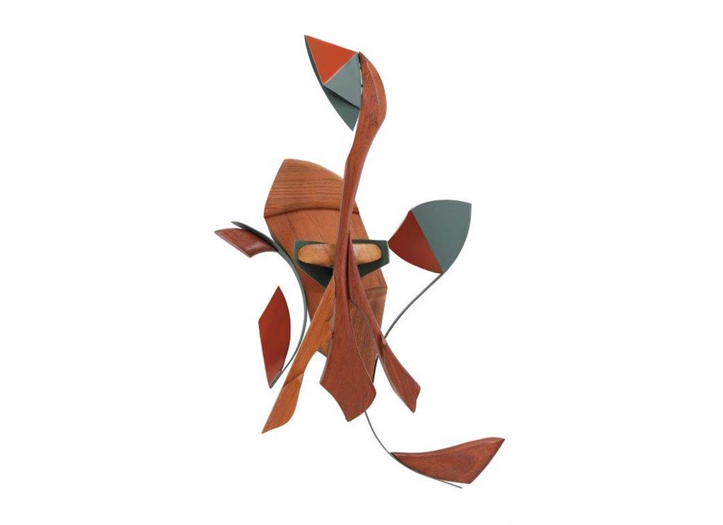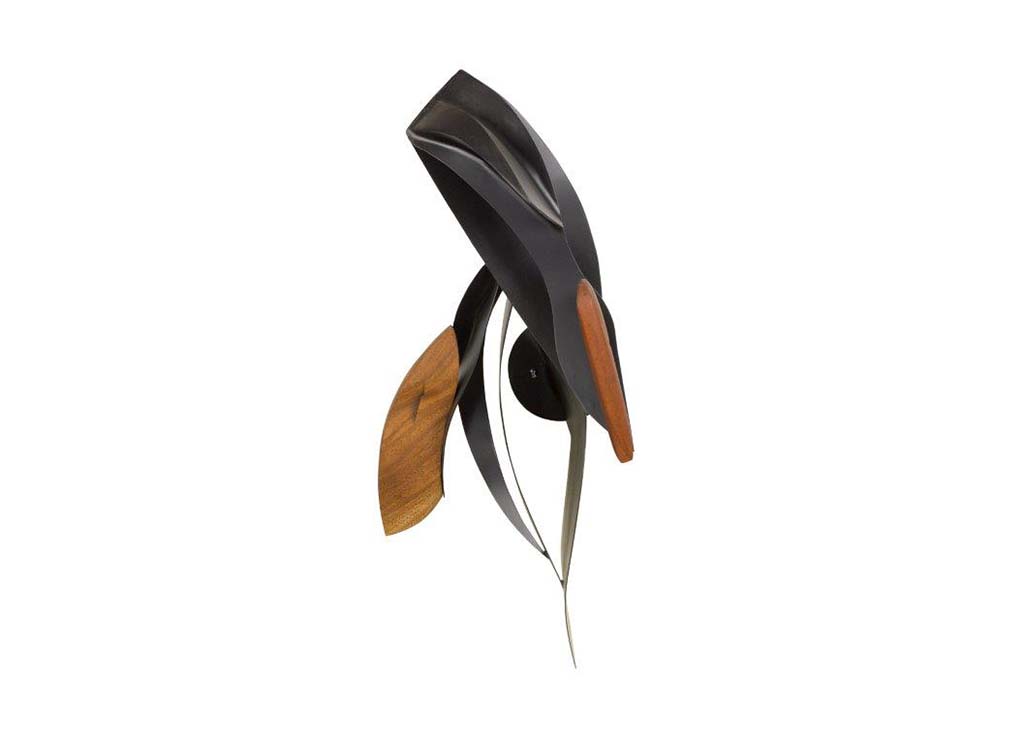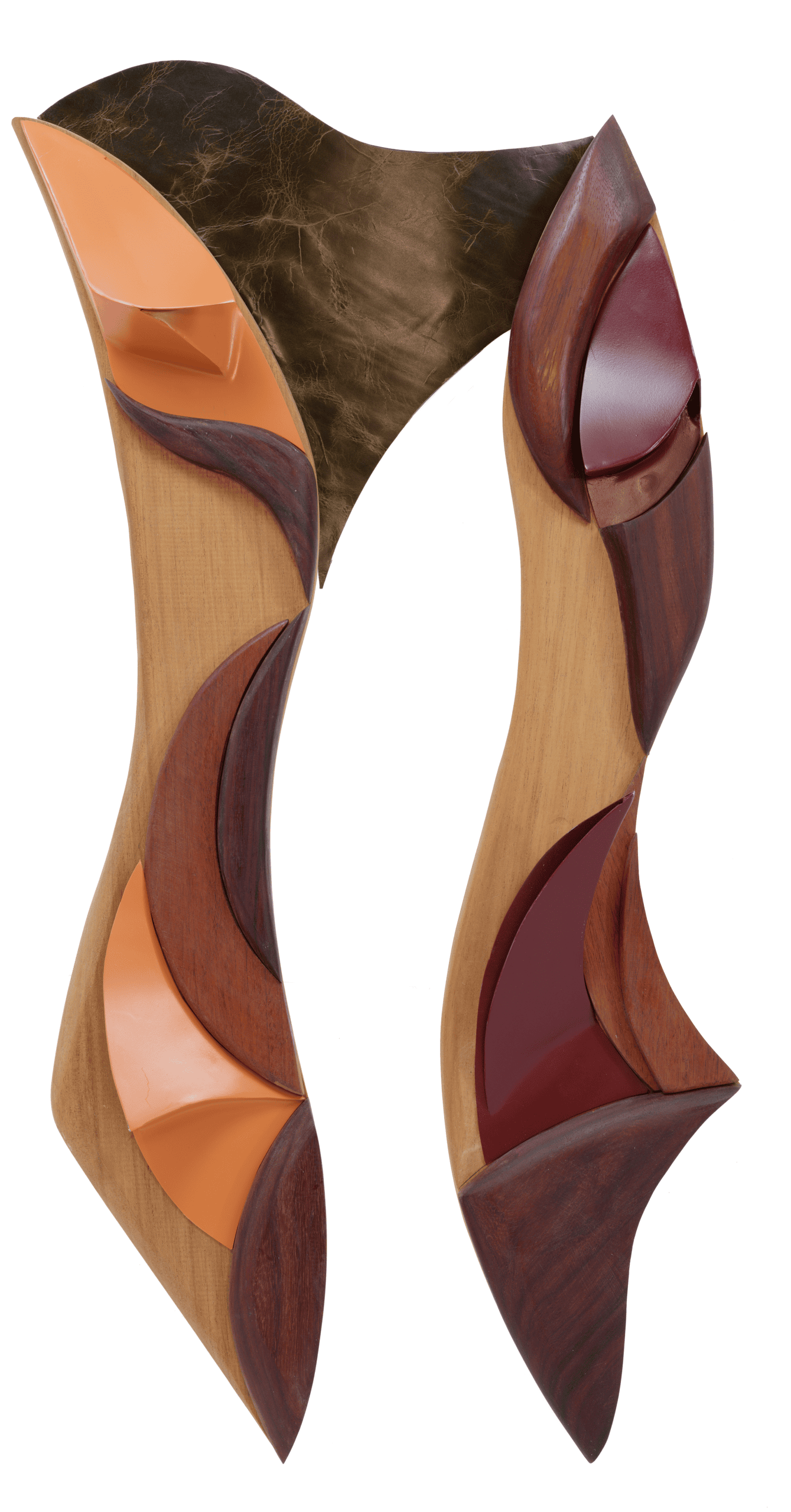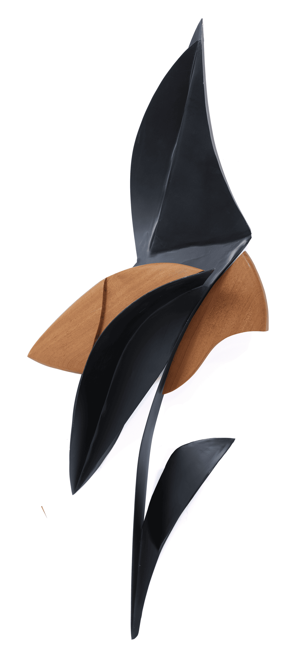 These sculptures of Michael Weinstein are designed to be mounted on any vertical surface. They integrate raw and painted welded and shaped steel in a range of colors, with exotic woods and leather.