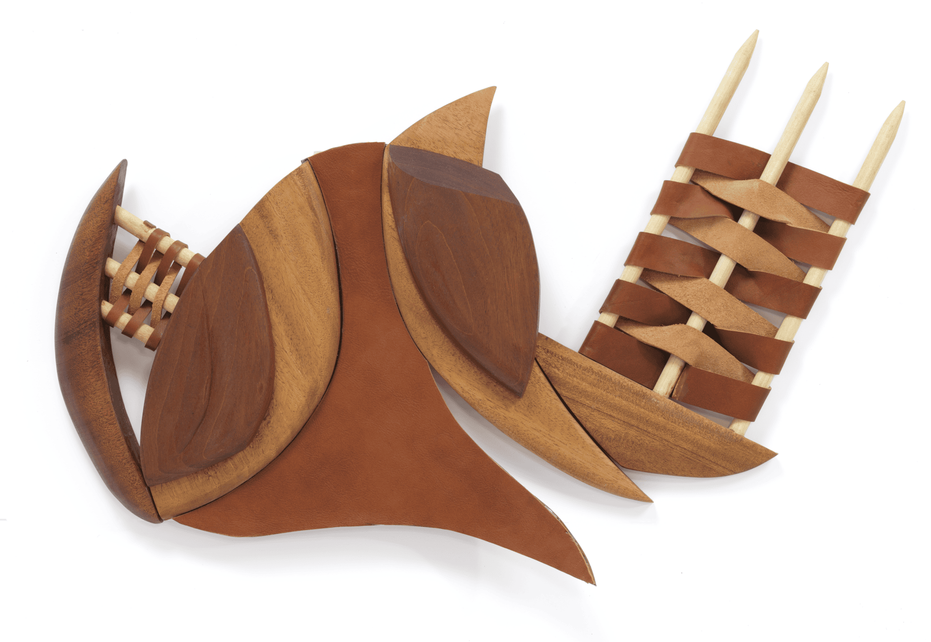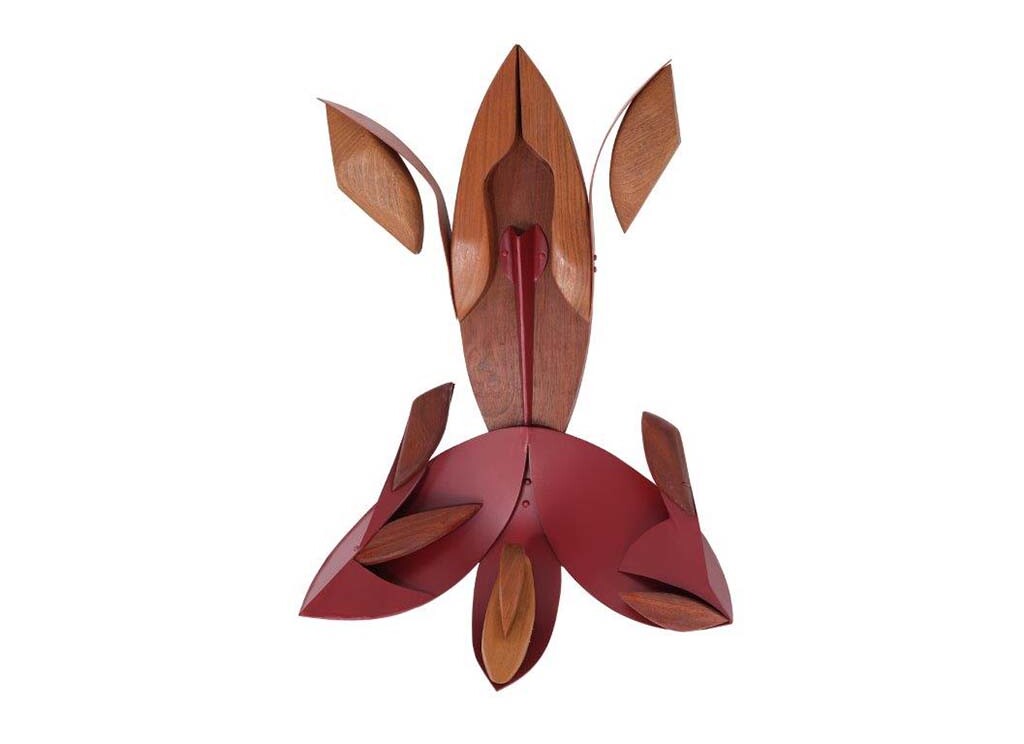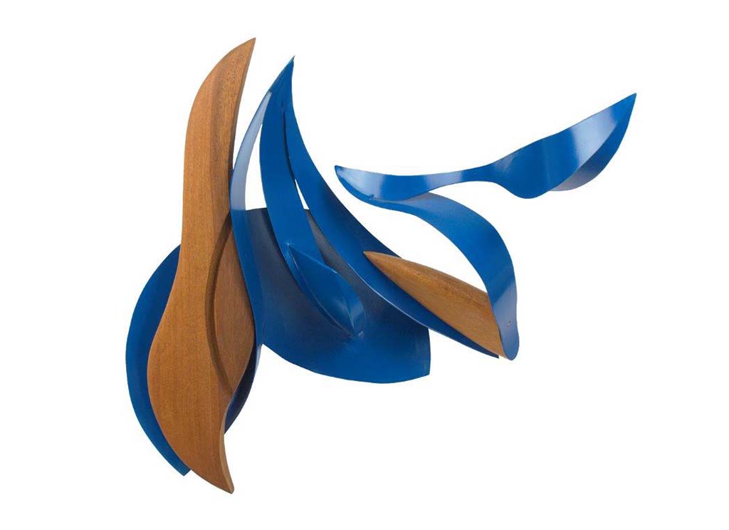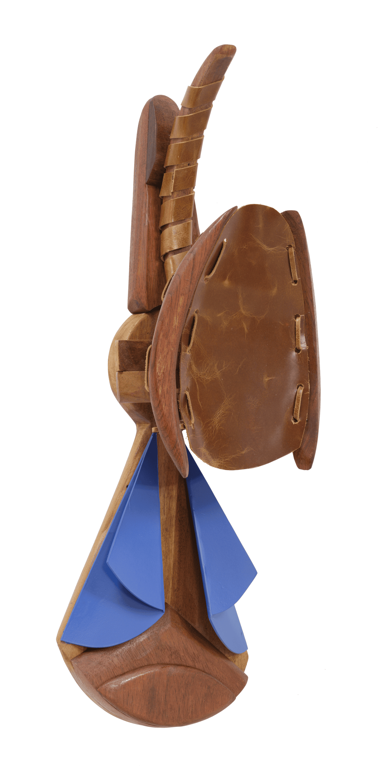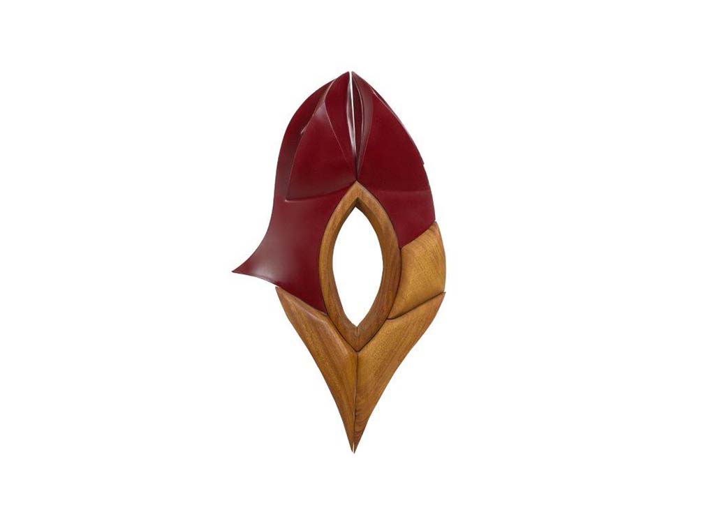 These sculptures of Michael Weinstein are designed to be mounted on any vertical surface. They integrate raw and painted welded and shaped steel in a range of colors, with exotic woods and leather.